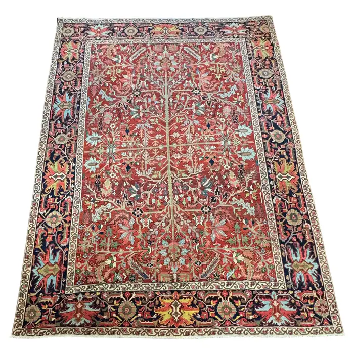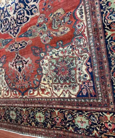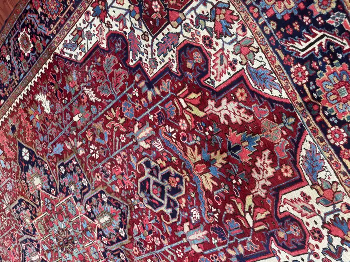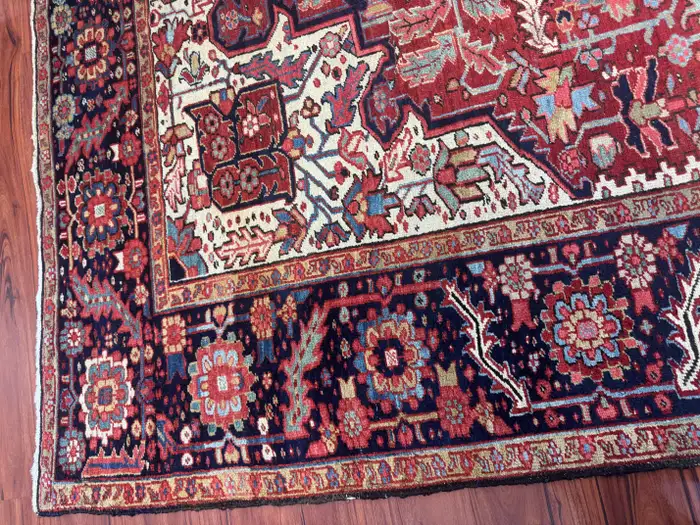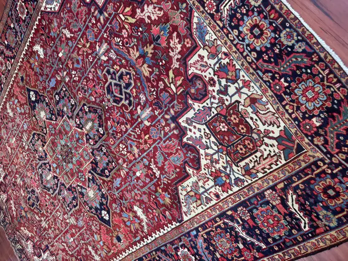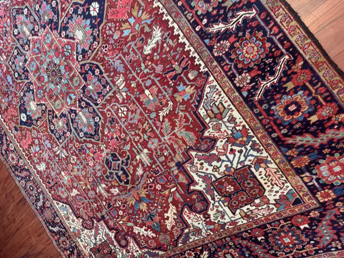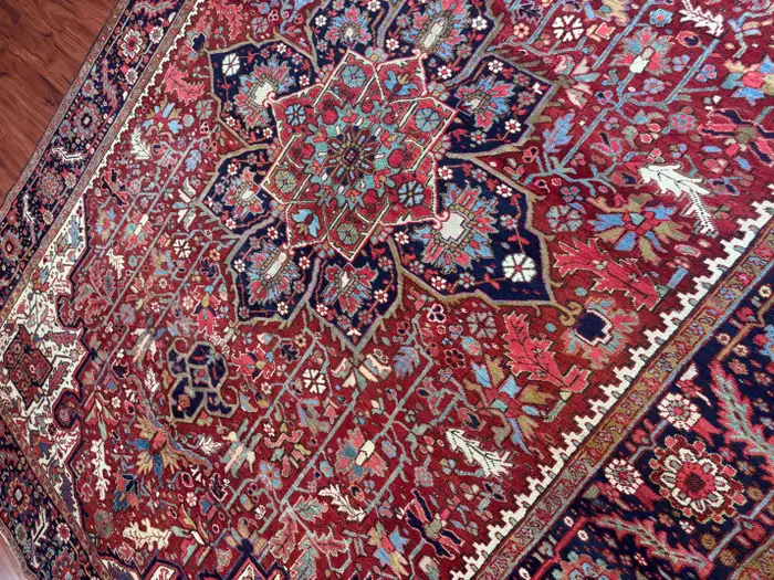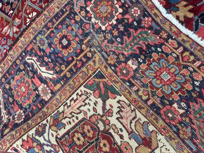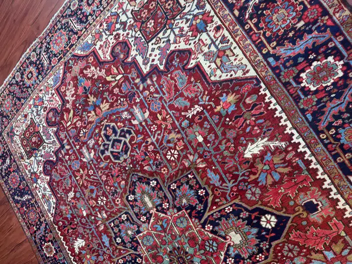 This exquisite antique Persian Heriz rug, originating from Iran in the early 1900s, is a remarkable example of Persian craftsmanship, history, and artistry. Woven by master artisans using time-honored techniques, this rug features an intricate geometric medallion design, a hallmark of Heriz rugs, which have long been prized for their bold patterns and rich cultural significance. Hand-knotted with the finest wool, this rug boasts a luxurious, soft texture and remarkable durability. The color palette—comprising deep indigo blues, vibrant rust reds, warm ivory, and earthy golds—is derived from natural vegetable dyes, ensuring its hues remain vivid even after more than a century. The distinct Heriz design, characterized by its majestic central medallion, angular floral motifs, and intricate borders, exudes both elegance and strength, making it an exceptional statement piece for any interior. Renowned for their durability and heirloom quality, antique Heriz rugs are among the most sought-after Persian carpets, favored by collectors, interior designers, and connoisseurs of fine textiles. Whether placed in a grand living room, a sophisticated dining area, or a refined study, this stunning Persian Heriz rug adds warmth, charm, and an air of distinction to any space. A true collector’s piece, this authentic antique Persian Heriz rug is more than just a floor covering—it is a piece of history, a work of art, and a testament to the extraordinary weaving traditions of Persia.
