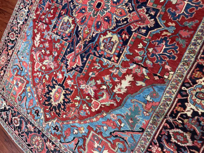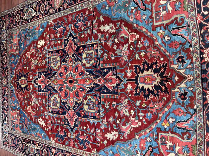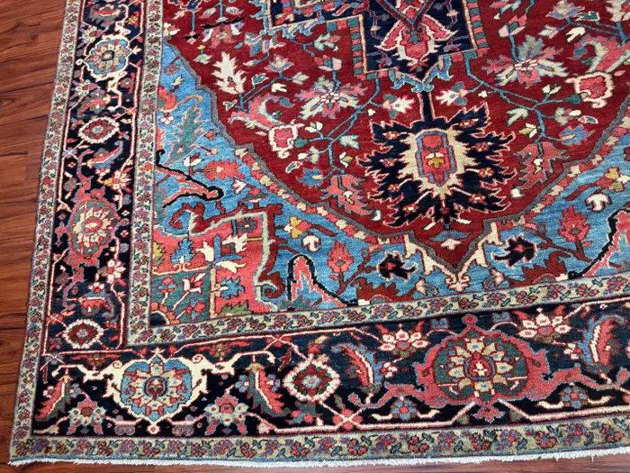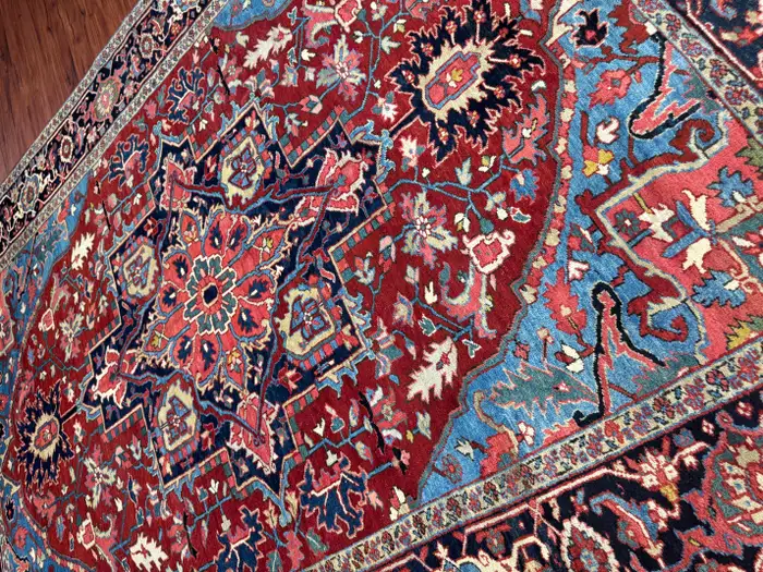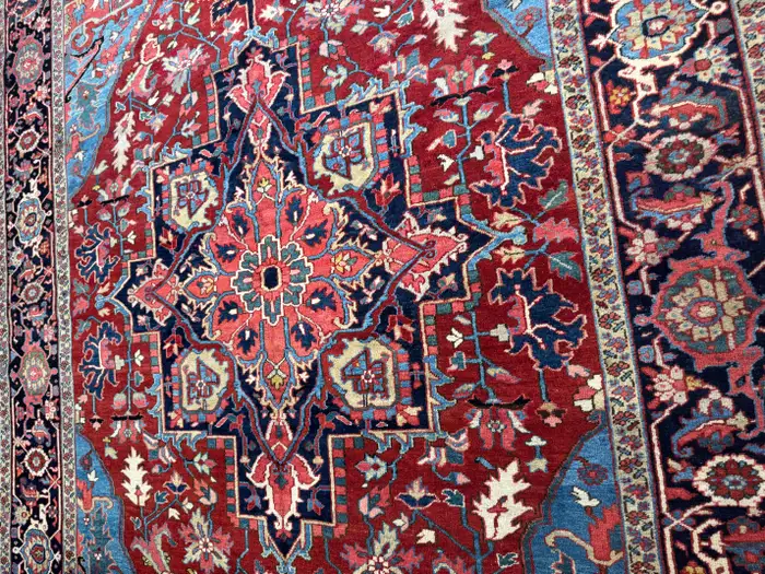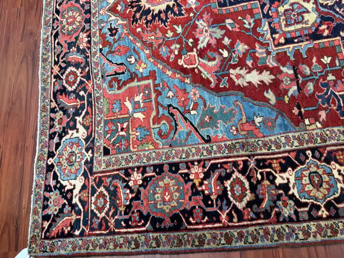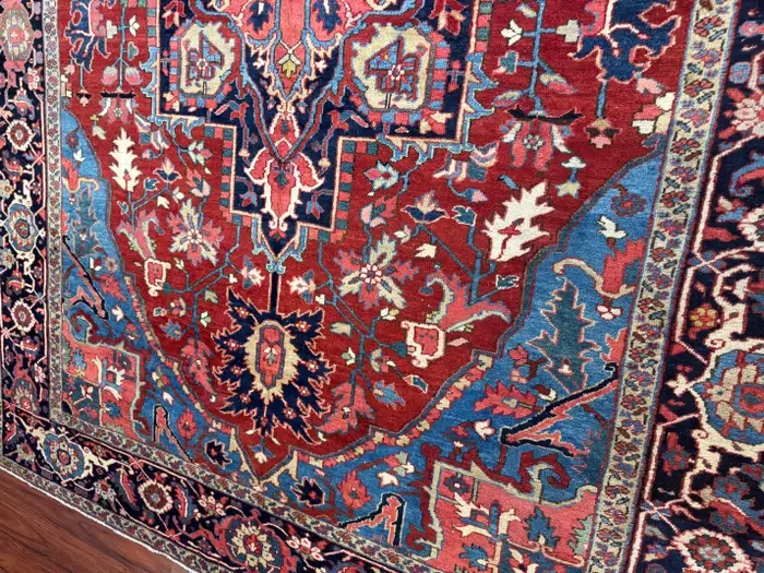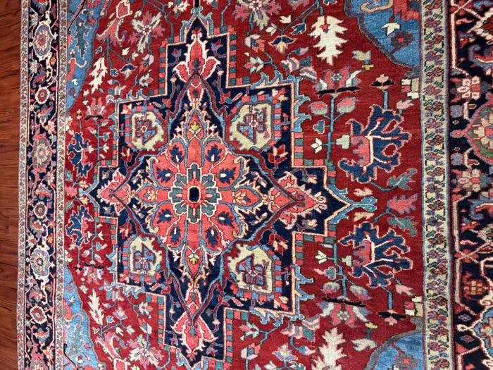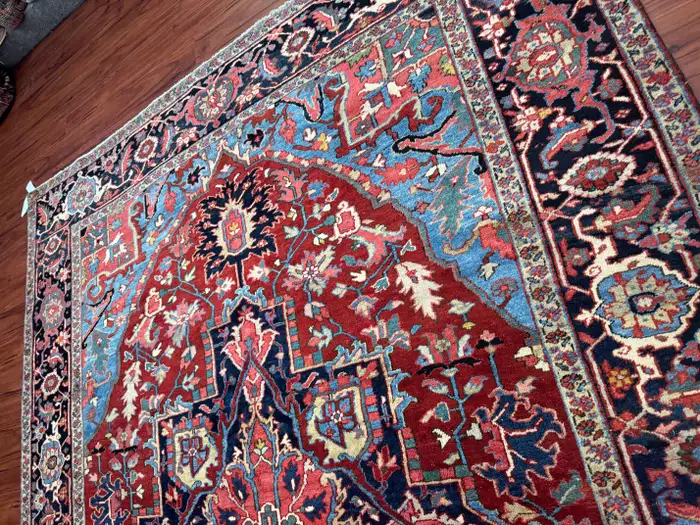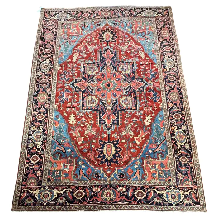 This exquisite antique Persian Heriz rug, originating from Iran in the early 1900s, is a remarkable example of Persian craftsmanship, history, and artistry. Woven by master artisans using time-honored techniques, this rug features an intricate geometric medallion design, a hallmark of Heriz rugs, which have long been prized for their bold patterns and rich cultural significance. Hand-knotted with the finest wool, this rug boasts a luxurious, soft texture and remarkable durability. The color palette—comprising deep indigo blues, vibrant rust reds, warm ivory, and earthy golds—is derived from natural vegetable dyes, ensuring its hues remain vivid even after more than a century. The distinct Heriz design, characterized by its majestic central medallion, angular floral motifs, and intricate borders, exudes both elegance and strength, making it an exceptional statement piece for any interior. Renowned for their durability and heirloom quality, antique Heriz rugs are among the most sought-after Persian carpets, favored by collectors, interior designers, and connoisseurs of fine textiles. Whether placed in a grand living room, a sophisticated dining area, or a refined study, this stunning Persian Heriz rug adds warmth, charm, and an air of distinction to any space. A true collector’s piece, this authentic antique Persian Heriz rug is more than just a floor covering—it is a piece of history, a work of art, and a testament to the extraordinary weaving traditions of Persia.