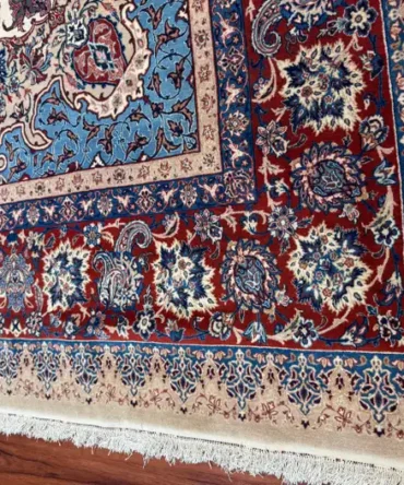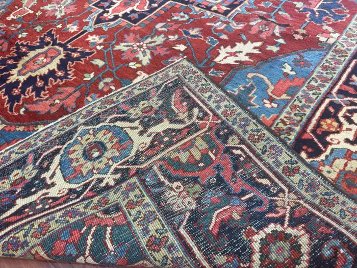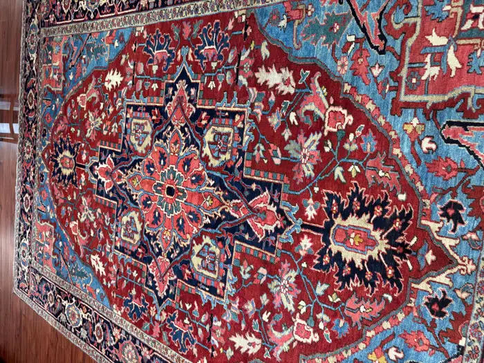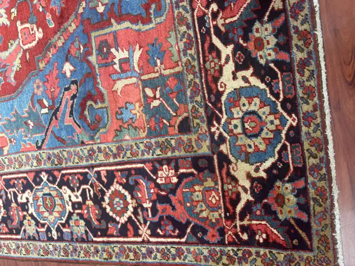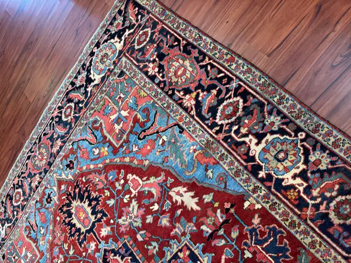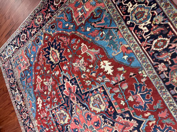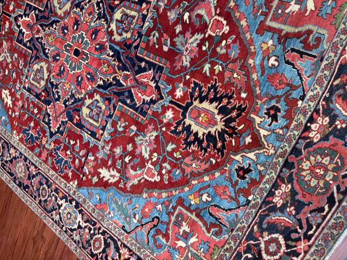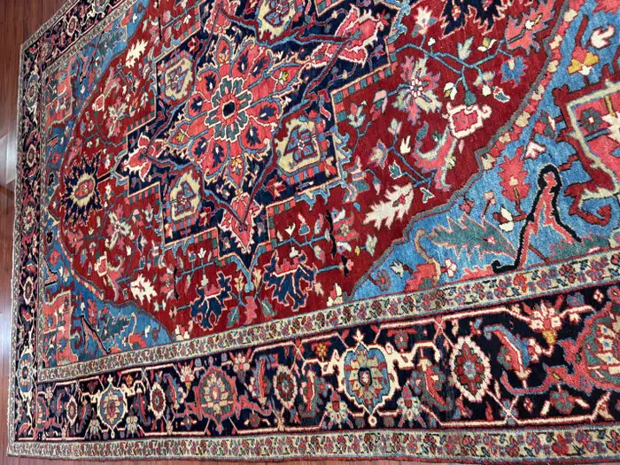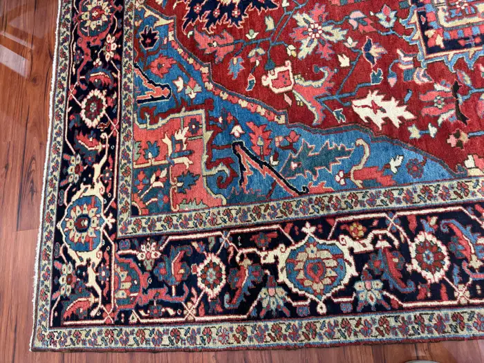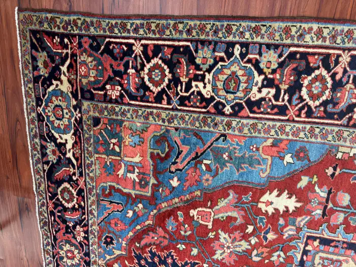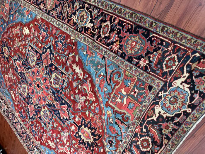 This exquisite antique Persian Heriz rug, originating from Iran in the early 1900s, is a remarkable example of Persian craftsmanship, history, and artistry. Woven by master artisans using time-honored techniques, this rug features an intricate geometric medallion design, a hallmark of Heriz rugs, which have long been prized for their bold patterns and rich cultural significance. Hand-knotted with the finest wool, this rug boasts a luxurious, soft texture and remarkable durability. The color palette—comprising deep indigo blues, vibrant rust reds, warm ivory, and earthy golds—is derived from natural vegetable dyes, ensuring its hues remain vivid even after more than a century. The distinct Heriz design, characterized by its majestic central medallion, angular floral motifs, and intricate borders, exudes both elegance and strength, making it an exceptional statement piece for any interior. Renowned for their durability and heirloom quality, antique Heriz rugs are among the most sought-after Persian carpets, favored by collectors, interior designers, and connoisseurs of fine textiles. Whether placed in a grand living room, a sophisticated dining area, or a refined study, this stunning Persian Heriz rug adds warmth, charm, and an air of distinction to any space. A true collector’s piece, this authentic antique Persian Heriz rug is more than just a floor covering—it is a piece of history, a work of art, and a testament to the extraordinary weaving traditions of Persia.