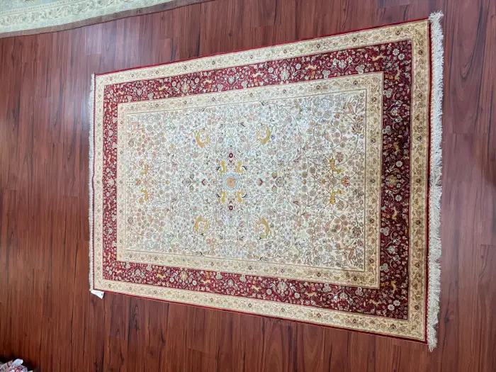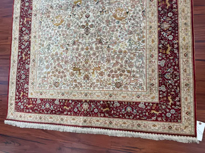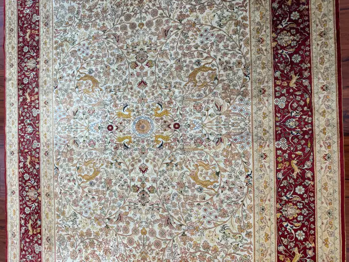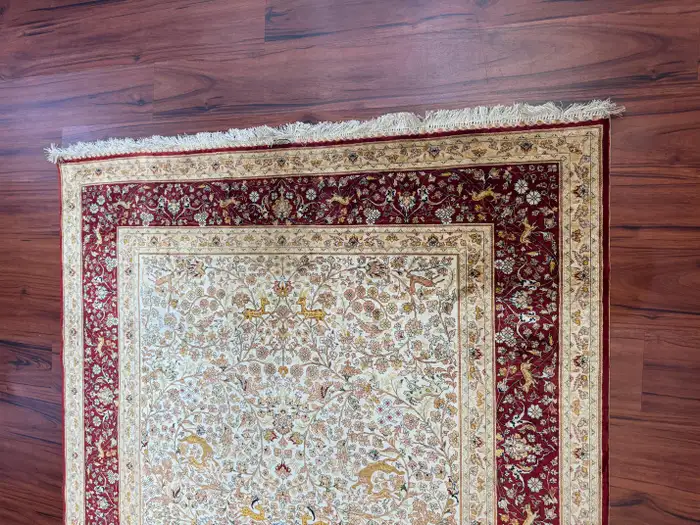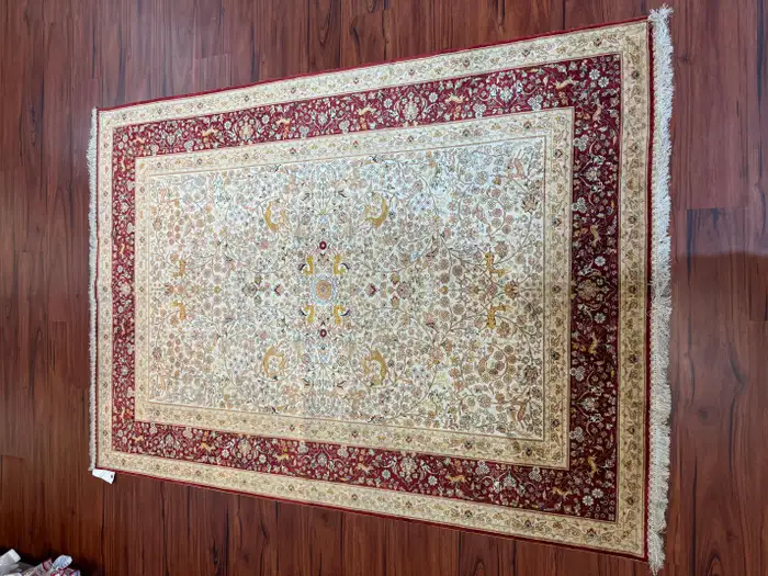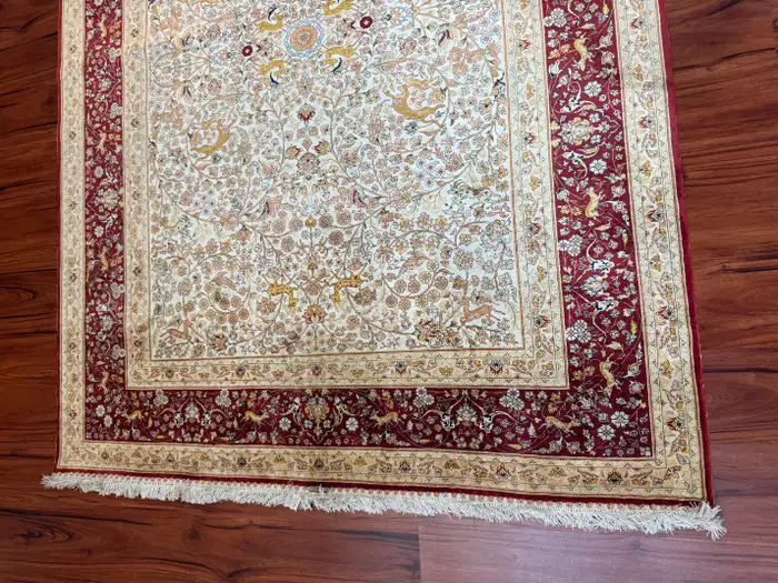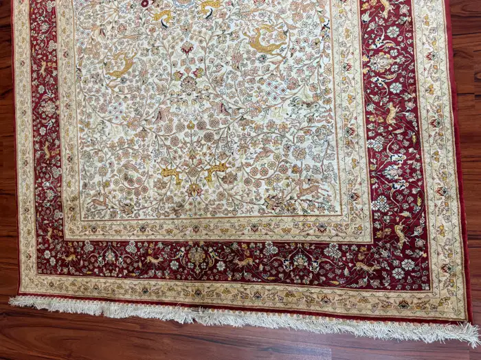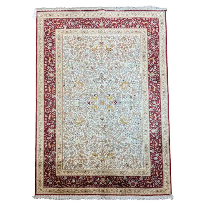 An exceptionally fine Turkish Hereke rug, originating from Turkey in the late 20th century, this piece is a true marvel of artistry and craftsmanship. Woven entirely from 100% silk, it boasts a luxurious texture and a captivating color palette that harmonizes perfectly with its intricate design. Preserved in outstanding condition, this rug radiates elegance and sophistication, making it a stunning centerpiece for any refined space or collection. A timeless treasure that embodies the pinnacle of Turkish weaving traditions.