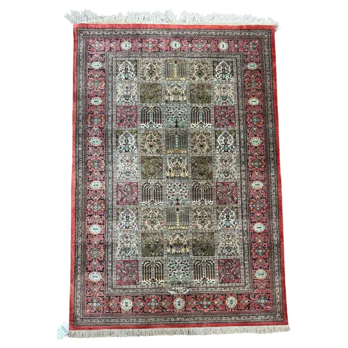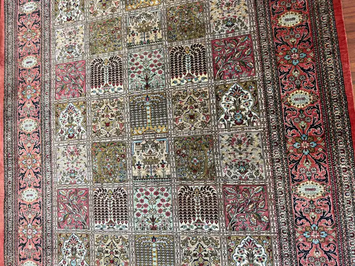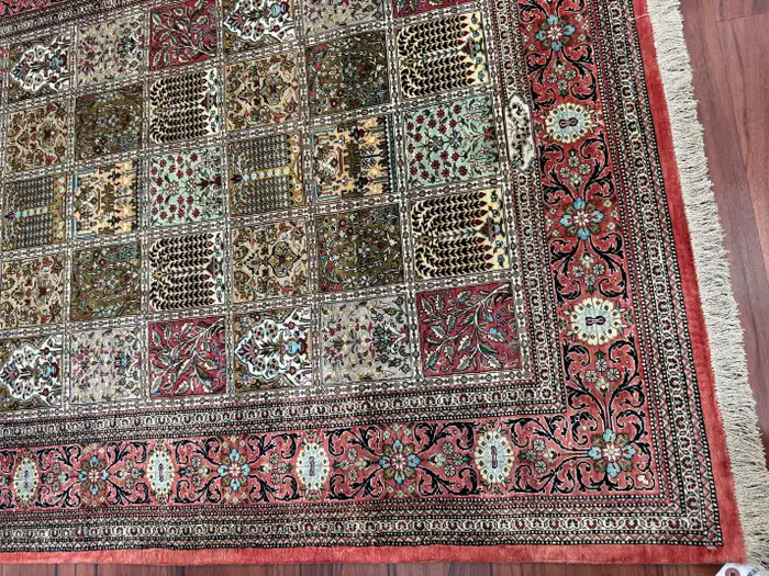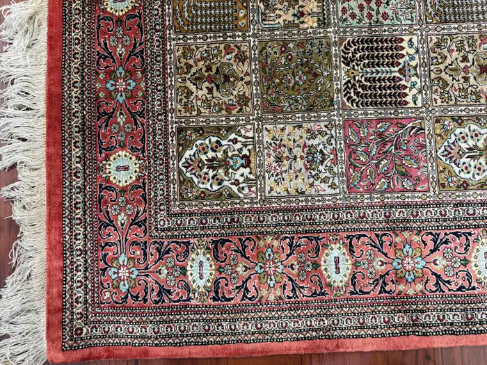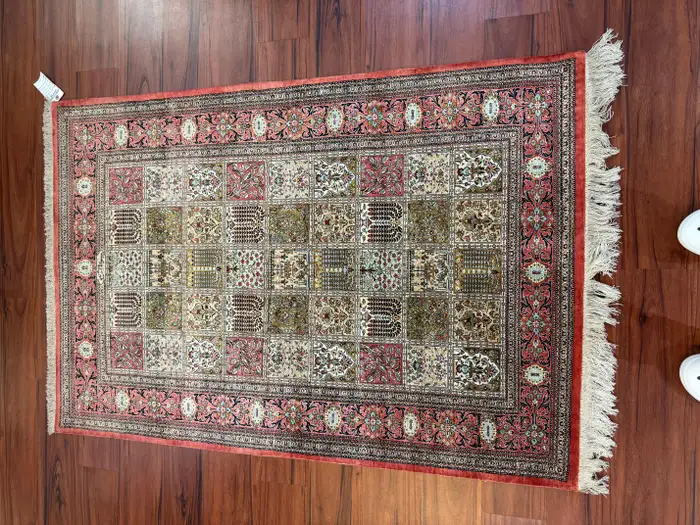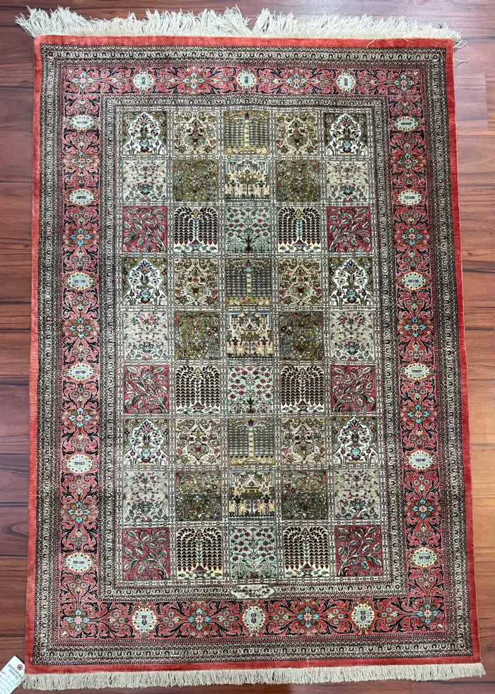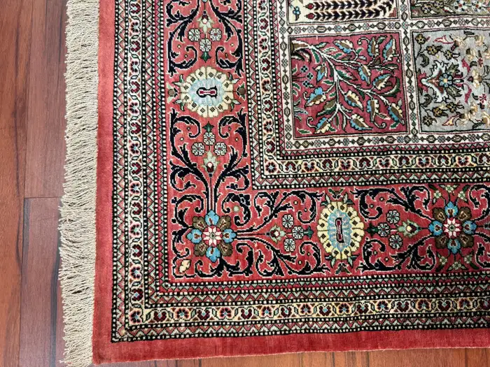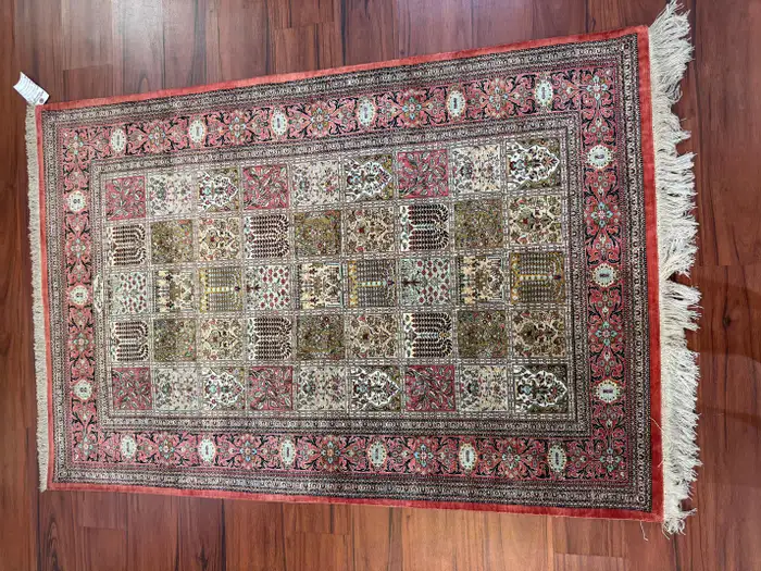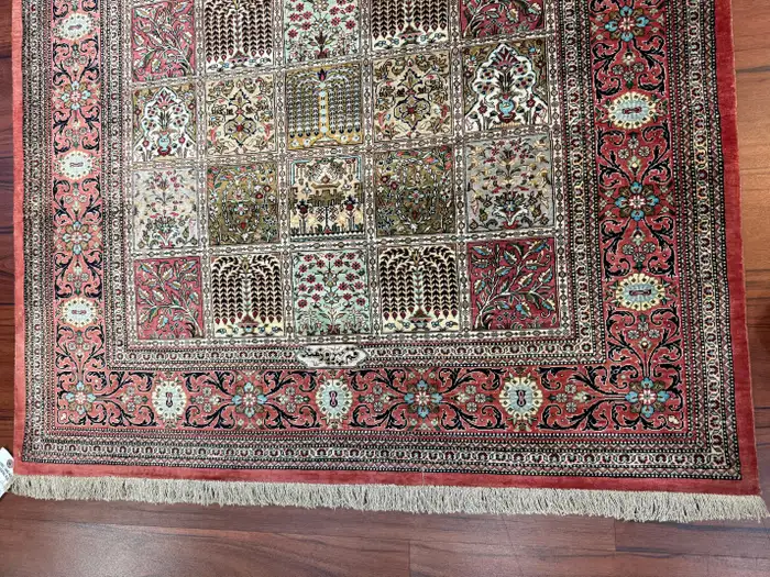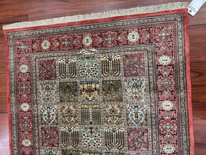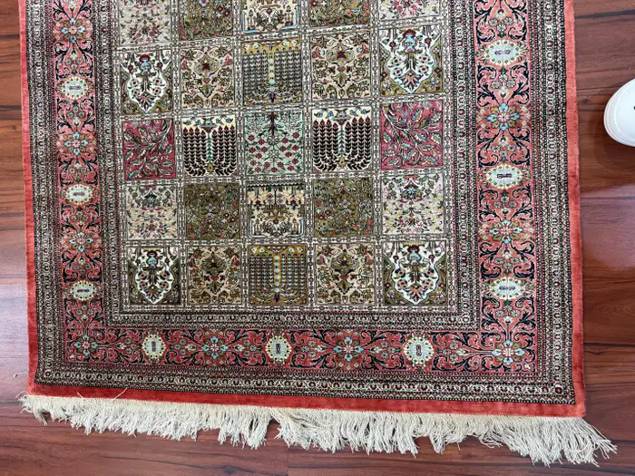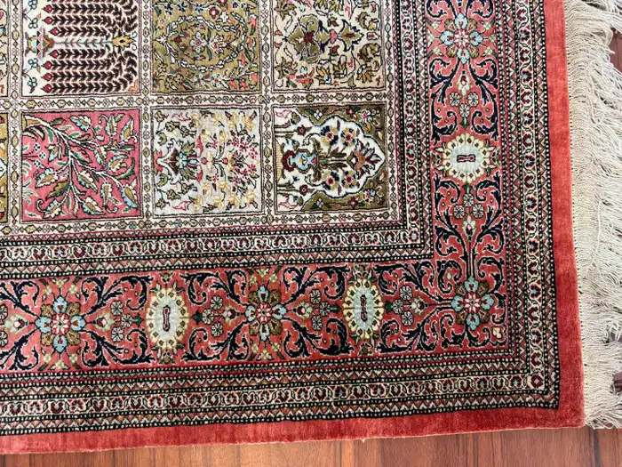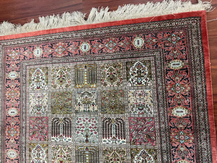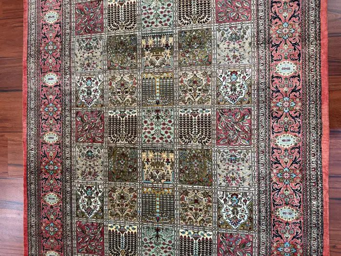 A stunning, very fine Persian Silk Qum rug, originating from Iran in the late 20th century. Crafted from 100% silk, this exquisite piece is in excellent condition, considering its rich history. Known for its intricate design and luxurious silk texture, this rug is a true masterpiece that will add sophistication and elegance to any space. Feel free to message me with any questions regarding this listing or any other items posted on my page!