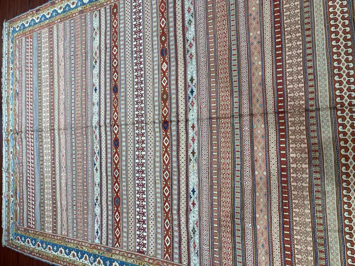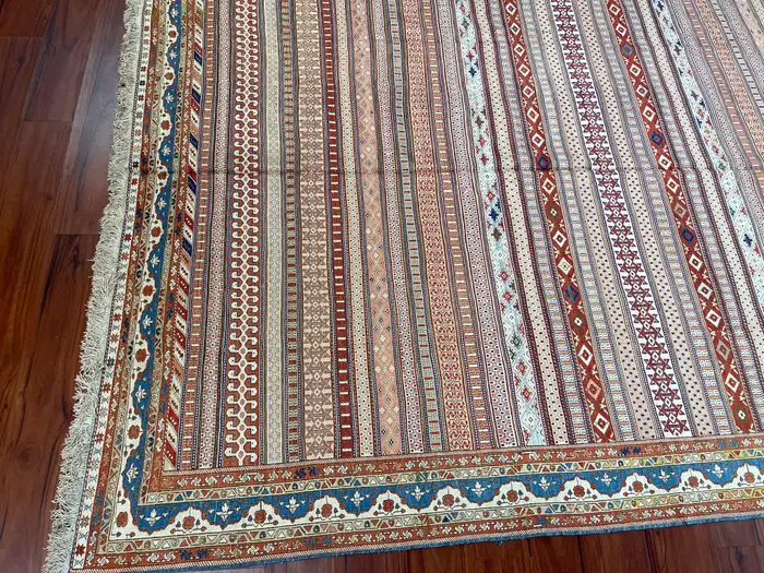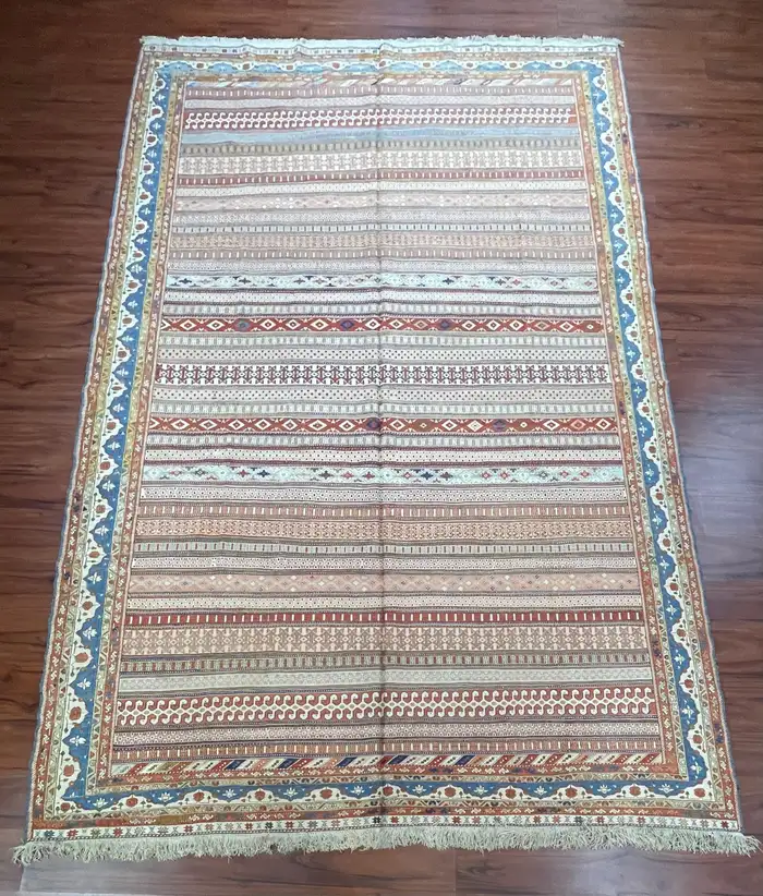 A stunning 100% Persian Silk Soumak rug, originating from Iran in the late 20th century. This exceptional piece is hand-knotted with intricate precision, showcasing the unparalleled craftsmanship of Persian artisans. The luxurious silk material enhances the vibrant colors and detailed patterns, making this rug a true work of art. In excellent condition, it has been carefully preserved, reflecting its timeless beauty and quality. Feel free to message me with any questions regarding this item or any other pieces listed on my page!
